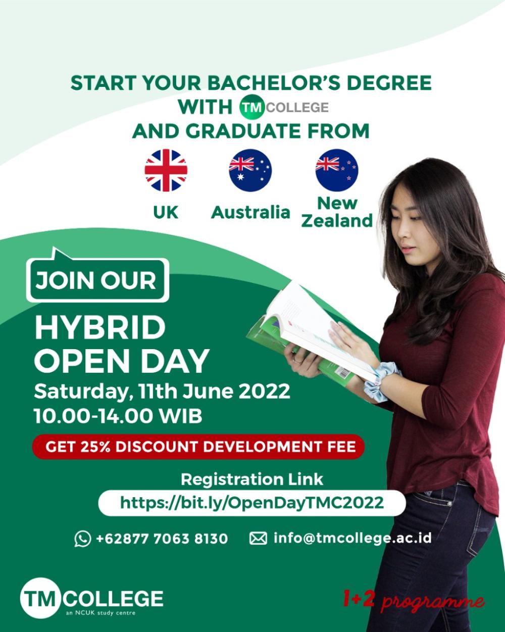 TM College menyelenggarakan Hybrid Open Day pada Sabtu, 11 Juni 2022 pukul 10.00-14.00 WIB. Open Day ini bertujuan untuk memperkenalkan program International Year One (IYOne) kepada murid-murid SMA, terutama yang baru saja lulus di Indonesia. Program ini juga biasa disebut #1+2Programme, calon mahasiswa dapat melanjutkan kuliah di UK, Australia, atau New Zealand dengan memulai kuliah tahun pertama di TM College, Jakarta. Lalu mereka dapat memilih untuk melanjutkan ke salah satu dari 24 universitas yang bekerjasama dengan TM College. Kurikulum TM College dari NCUK (The Northern Consortium United Kingdom) dengan berfokus pada program bisnis.