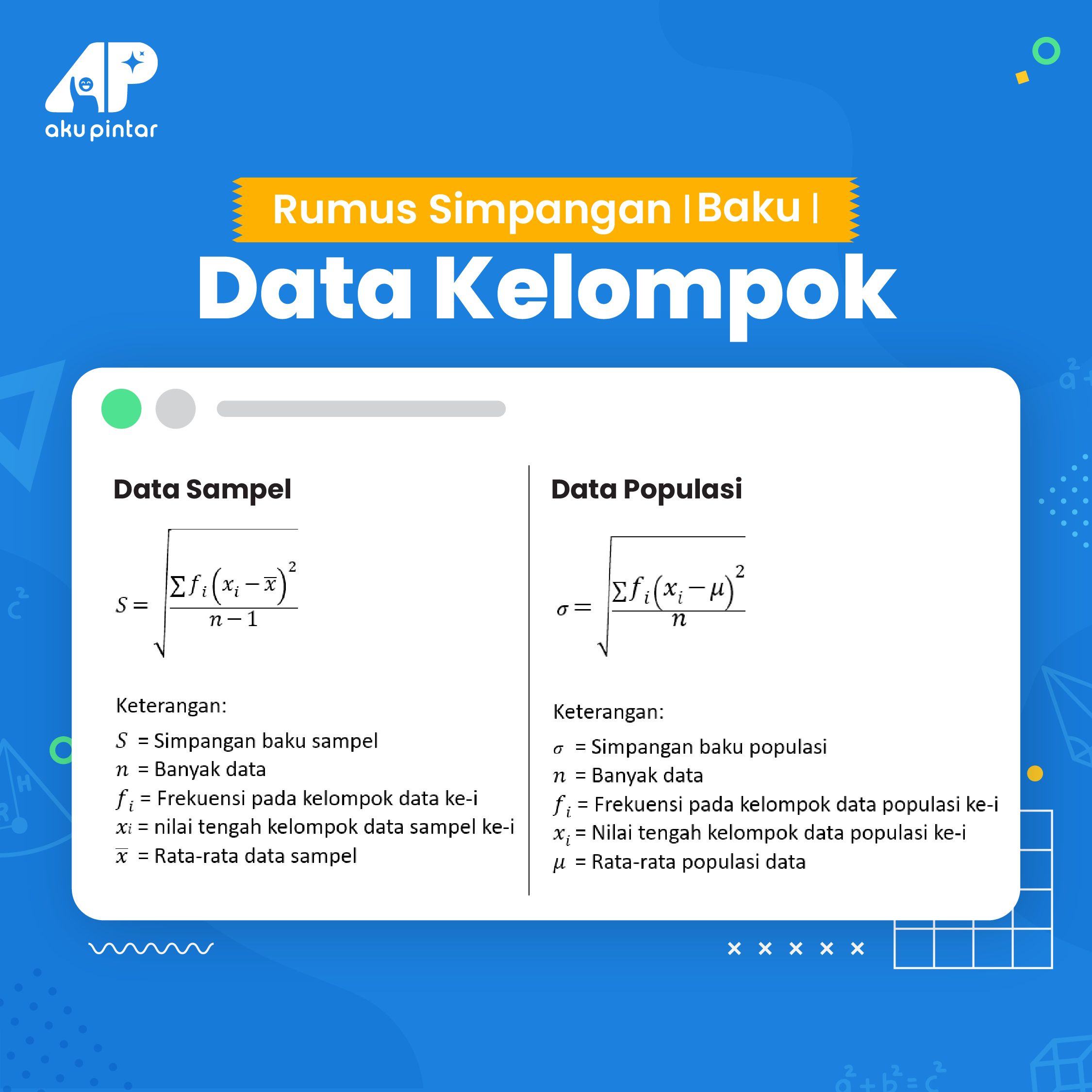Sebelum belajar cara mencari simpangan baku dengan rumus, kita mesti tahu rumus simpangan rata-rata (varians) terlebih dahulu. Kenapa begitu?