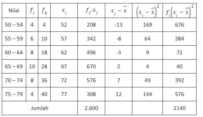 Pada contoh soal simpangan baku ini, kita perlu mencari nilai rata-ratanya terlebih dahulu. Untuk mempermudah perhitungan, kita gunakan bantuan tabel, ya! Kamu juga boleh menghitung dengan bantuan kalkulator kok, Sobat! Mantap kan, ya?