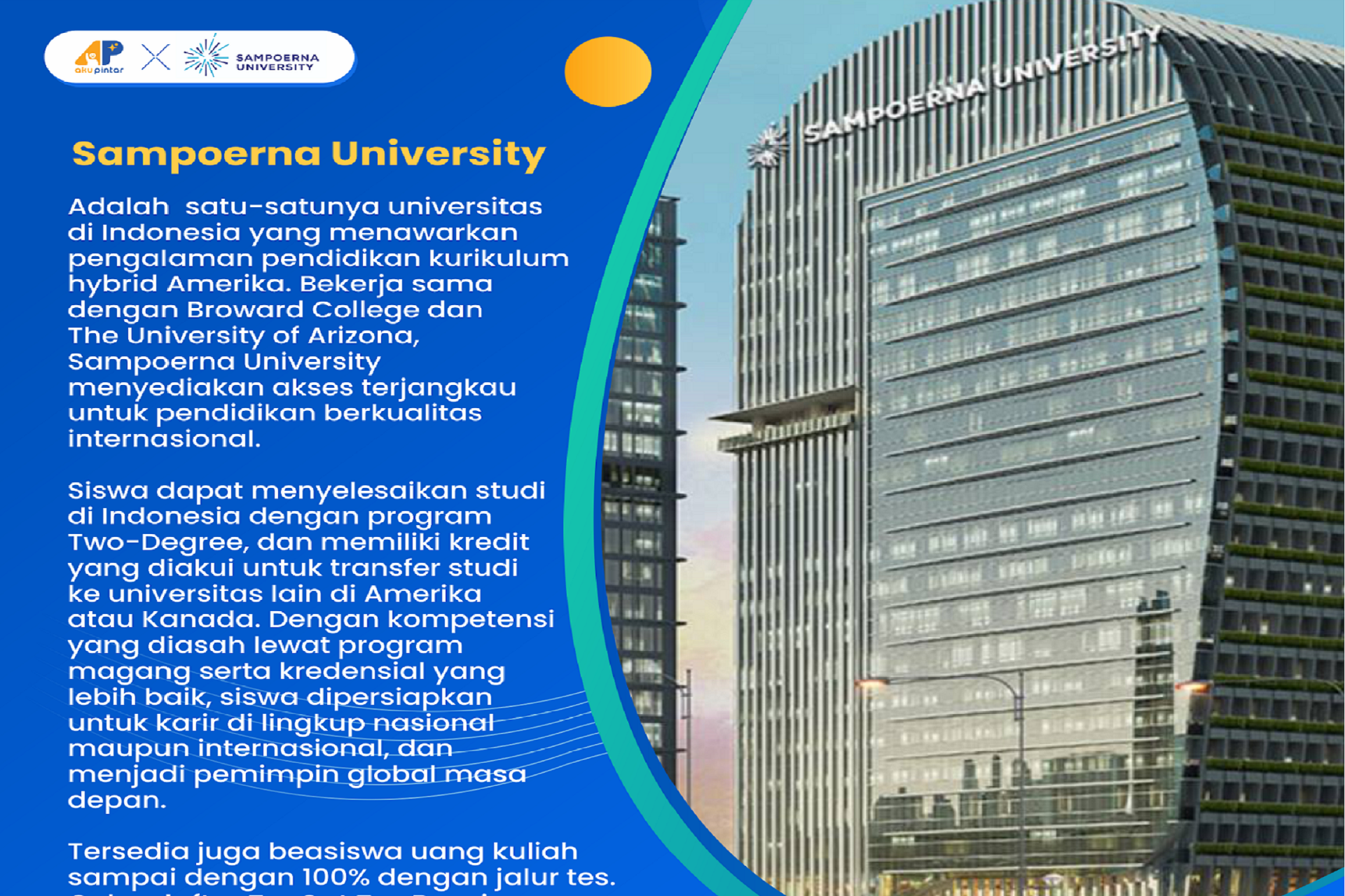 Kuliah di perguruan swasta sebenarnya tidak selalu mahal. Masih ada opsi beasiswa yang dapat membantu meringankan biaya kuliah. Salah satu universitas swasta yang bahkan menyediakan pembiayaan kuliah sampai 100 persen adalah Sampoerna University.