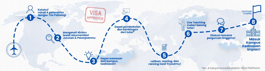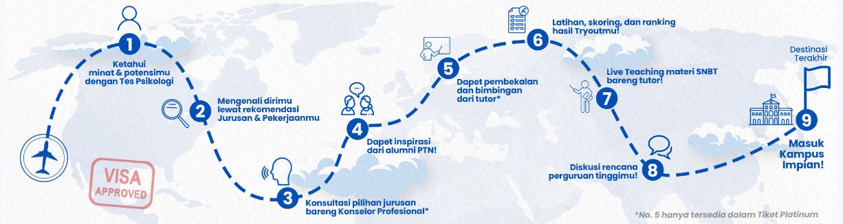 Untuk menjadi mahasiswa PTN-PTN di atas, kamu harus lolos SNBT dan mengikuti UTBK. Maka, Try Out yang harus diikuti adalah Try Out UTBK. Saat ini tersedia tiga macam tiket yang bisa kamu gunakan untuk "terbang" menuju kampus impianmu melalui peta di atas:
