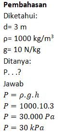 Seorang penyelam menyelam dengan kedalaman 3 m, massa jenis air 1.000 kg/m³, konstanta gravitasi pada tempat tersebut adalah 10 N/kg. Besar tekanan hidrostatisnya adalah …
