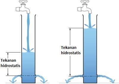 Jadi semakin besar jarak titik ukur dengan permukaan air, maka akan semakin besar tekanan hidrostatis pada titik tersebut. Fenomena ini dapat dilihat pada gambar di bawah di mana semakin besar ketinggian air, maka akan semakin besar pula tekanan hidrostatis di dasar bejana. Akibatnya, air akan muncrat lebih jauh pada bejana sebelah kanan karena tekanan yang lebih tinggi dibandingkan bejana di sebelah kiri.