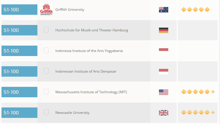 Baru minggu ini TopUniversities.com menelurkan daftar terbarunya dalam pemeringkatan QS World Universities yang banyak dianut institusi di Indonesia dan beberapa institusi dunia. Dan dalam pemeringkatan tersebut Indonesia menempatkan 3 institusi seni terbaiknya dalam jajaran 100 institusi seni pertunjukan terbaik.