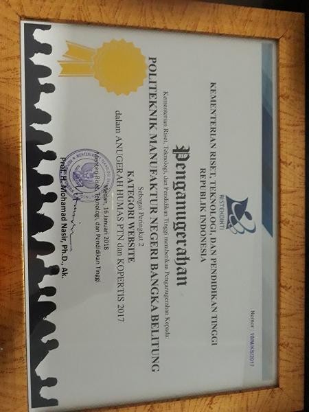 Polmanbabel berhasil mendapatkan perhargaan sebagai peringkat 2 dalam kategori Website tingkat Politeknik dalam gelaran Anugerah Humas PTN dan Kopertis 2017 yang diselenggarakan oleh Kementerian Riset, Teknologi dan Pendidikan Tinggi di Universitas Sumatera Utara (USU).