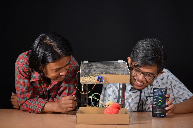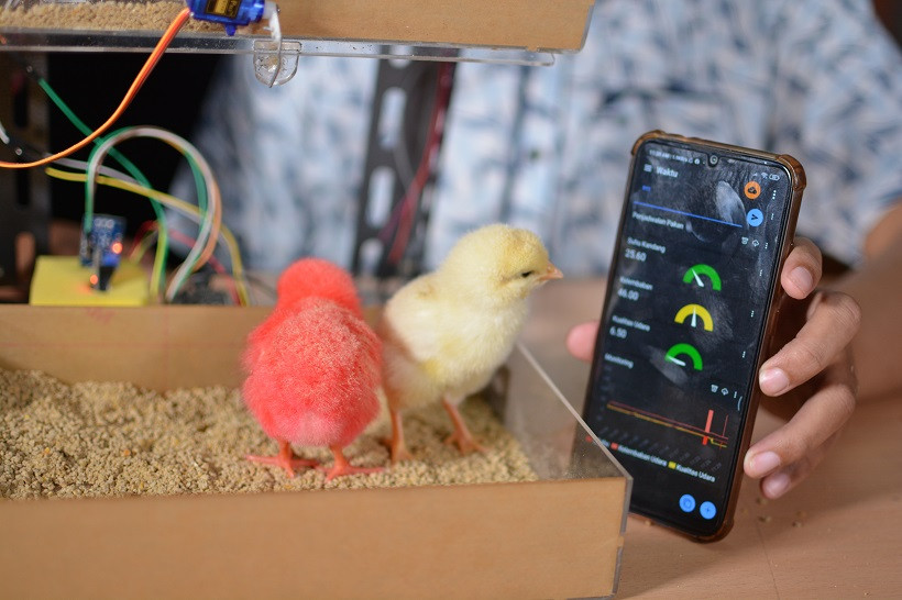 “Alat ini sudah terintegrasi dengan handphone sehingga pengguna bisa memantau kondisi kandang ayam dan juga memberi pakan ayam secara otomatis lewat handphone,” tutur Rizky Alief yang merupakan leader dalam project inovasi PATRIOT ini. Lebih lanjut Rizky menjelaskan bahwa monitoring suhu kandang ayam bermanfaat untuk mengukur temperatur dari kandang ayam apakah dalam kadar normal (hangat) atau tidak. Sedangkan monitoring kelembapan untuk mengukut kondisi basah atau kering dari kandang ayam. “Nah kalau untuk pakan otomatis, jadi kita setting mau jam berapa kasih makan ayamnya, nanti otomatis pakannya jatuh ke dalam kandang,” imbuh mahasiswa angkatan 2019 ini.