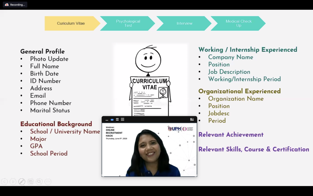 Berikut ini tips yang dibagikan Career Center UPH dalam webinar bertajuk “Online Recruitment Hack” yang diselenggarakan bersama PT Bank Central Asia, Tbk pada 11 Juni 2020. Tips ini disampaikan oleh Laura Andiny Sutrisna – Assistant Vice President Human Capital Management BCA kepada hampir 200 peserta webinar.
