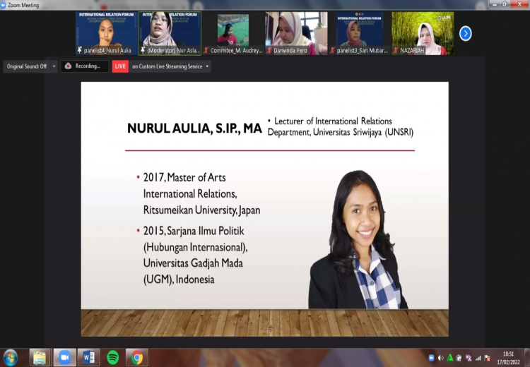 Program Studi Ilmu Hubungan Internasional, Fakultas Ilmu Sosial dan Ilmu Politik Universitas Sriwijaya (Fisip Unsri) bersama Universiti Utara Malaysia (UUM) menggelar forum diskusi Panelist dengan tema “Bilateral Dynamics: Crucial Issues In Contemporary Indonesia-Malaysia” yang di selenggarakan secara virtual melalui aplikasi zoom meeting, Kamis (17/2/2022).
